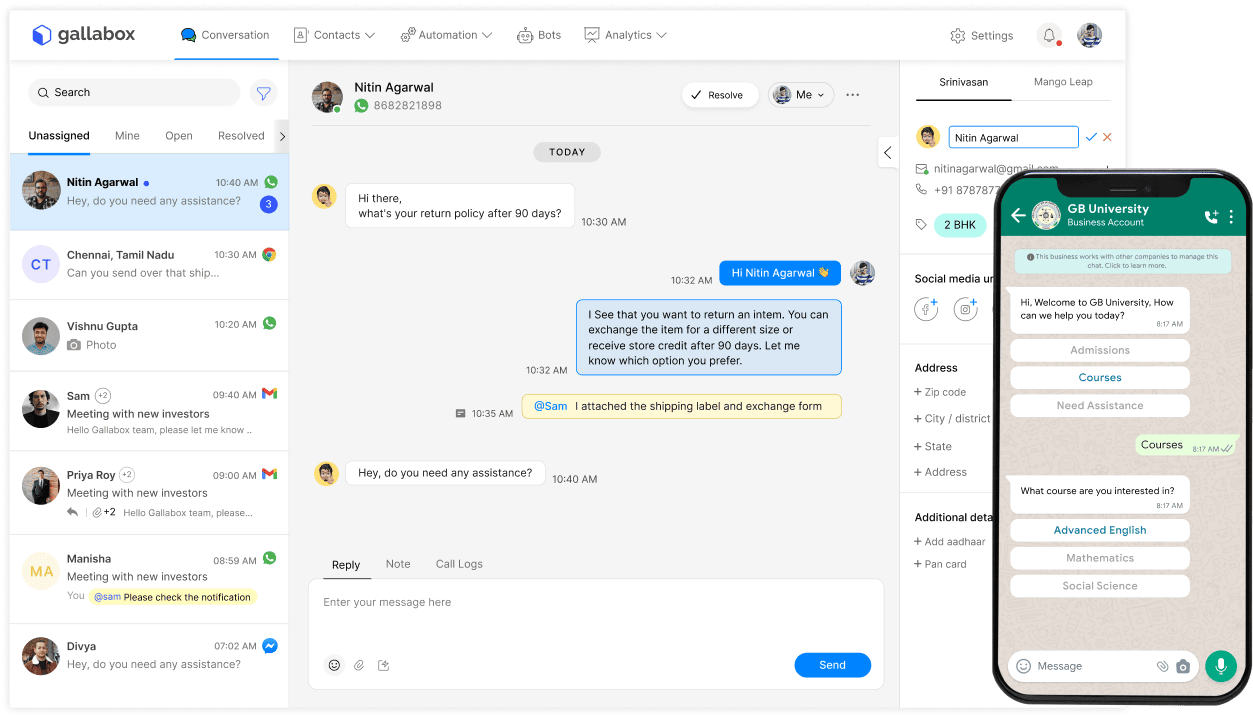 With Gallabox, companies can automate replies, manage conversations in a shared inbox, and integrate WhatsApp with CRM systems to capture and convert leads efficiently.